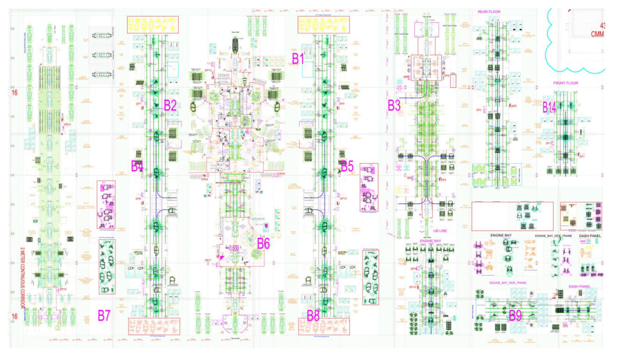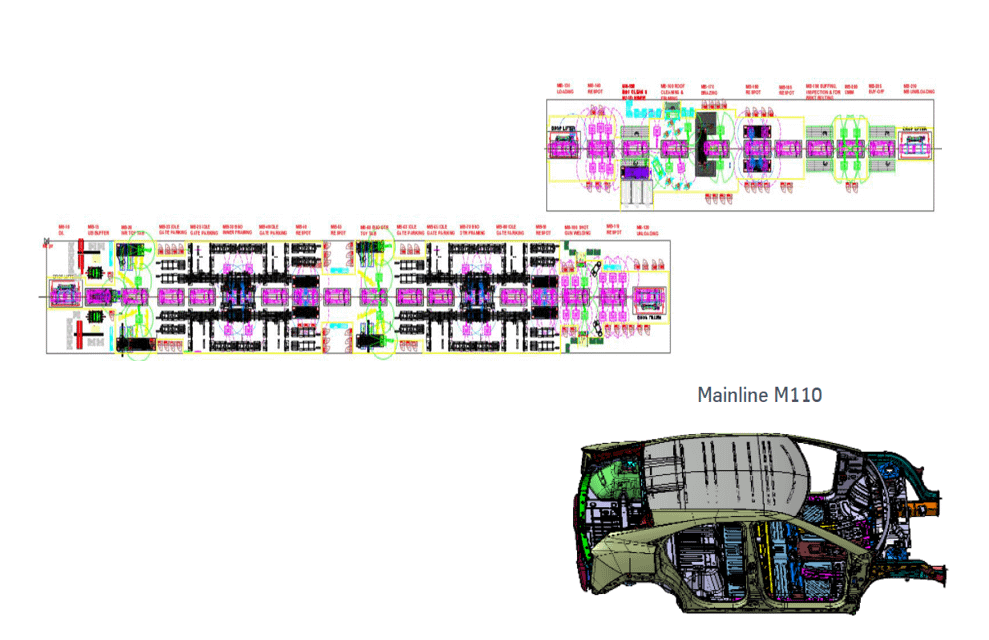 Panel Build Layout, Discrete Event Simulation, Line Balancing, Cycle time, Yamazumi Charts, Weld point Management, Gun Selection, Ergo Study, Clamping Scheme, Glue / Weld Studies, Station Content